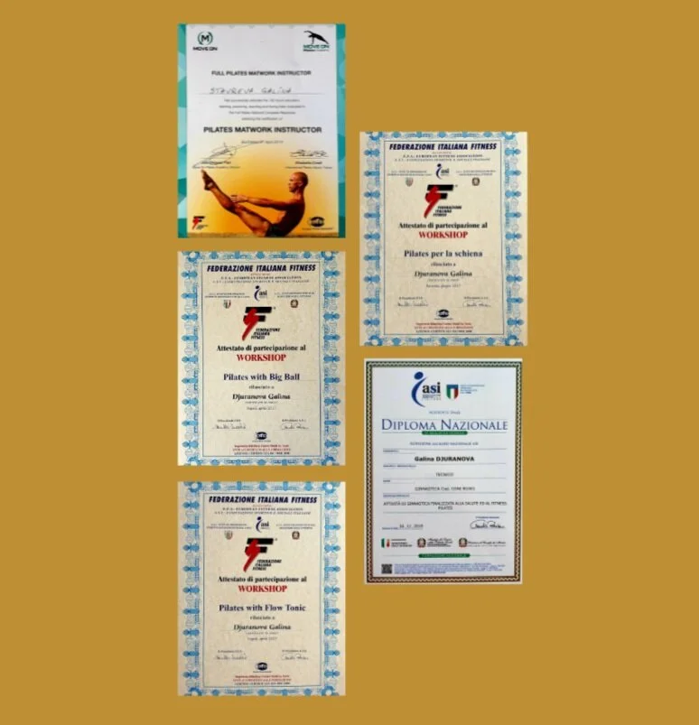 Това са част от сертификатите от обучения, които съм преминала. На много места в този уебсайт ще прочетете колко съм благодарна на учителите, с които ме срещна моето Пилатес пътуване. Имам късмета да черпя вдъхновение от изключителни специалисти. Моите преподаватели са хора с много знания, изтънчен вкус и висока култура. С тяхна помощ прилагам наученото с безкрайно удовлетворение.